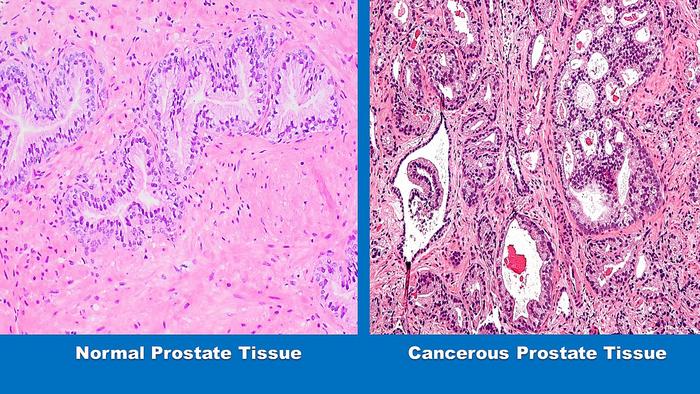 Photomicrographs comparing normal prostate tissue to cancerous. A new study, led by Johns Hopkins Medicine, shows — for what is believed to be the first time — that a healthy diet may help prevent low grade prostate cancer from progressing to a more aggressive disease.