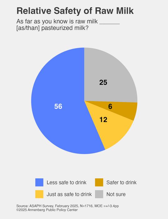 A majority of U.S. adults (56%) knows that drinking raw milk from cows, sheep, or goats is less safe than drinking pasteurized milk. But over 4 in 10 Americans either are not sure (25%), think raw milk is “just as safe to drink” as pasteurized milk (12%) or think it is “safer to drink” (6%), according to a recent survey by the Annenberg Public Policy Center (APPC) of the University of Pennsylvania. The findings are statistically unchanged from APPC’s July 2024 survey. Almost a third of people (32%) know that drinking raw milk increases a person’s risk of foodborne illness, though 14% think it has no effect and 51% are not sure.