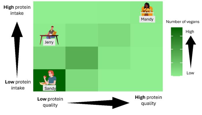 Variation in vegan dietary patterns and their influence on total protein intake and protein quality using a story of three vegans. Mandy demonstrates the most balanced approach of achieving both high total protein intake and protein quality. Jerry, on the other hand, meets his protein intake but his diet falls short on protein quality. Sandy represents a common pattern observed in our cohort, and her existing diet fails in meeting both protein quantity and protein quality. In summary, our findings show a high protein intake alone does not always guarantee adequate protein quality.